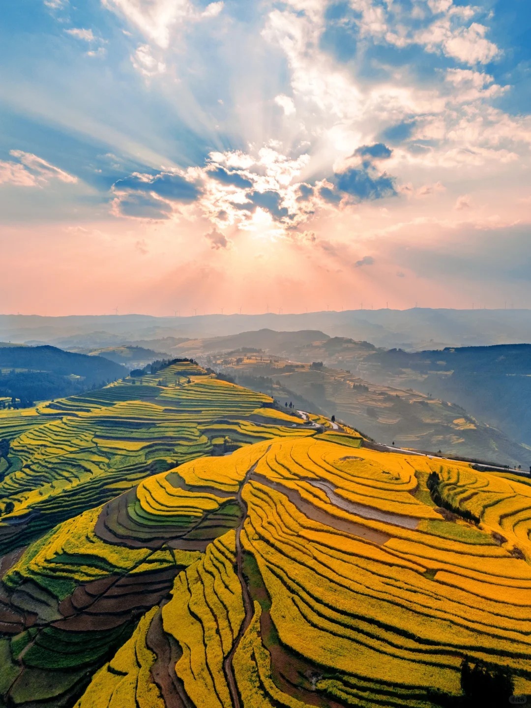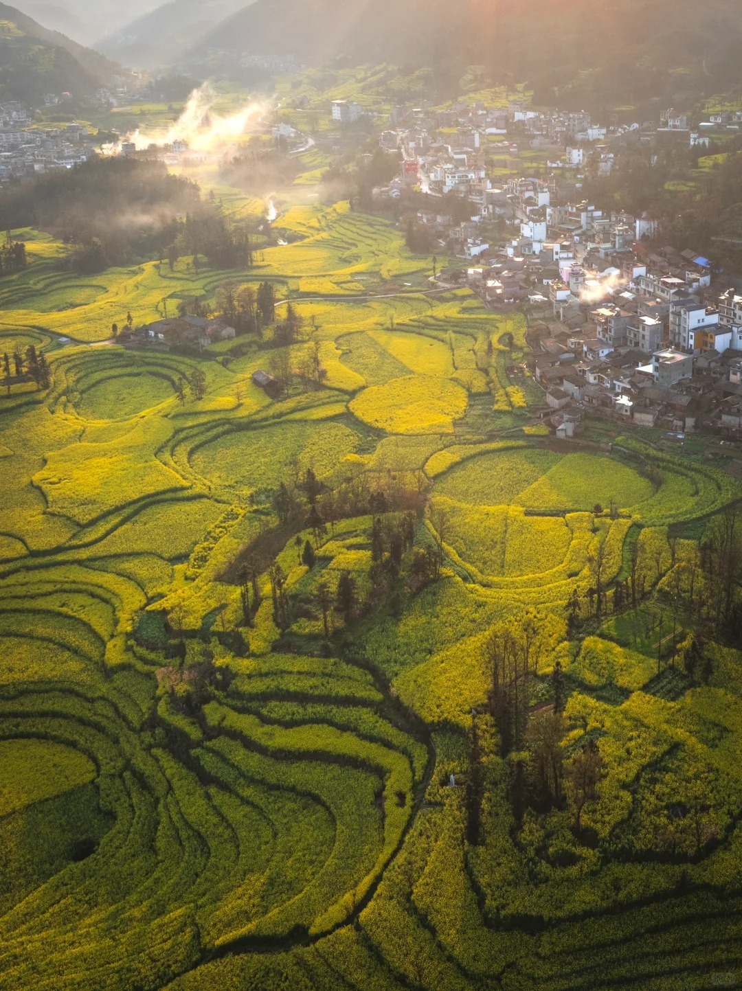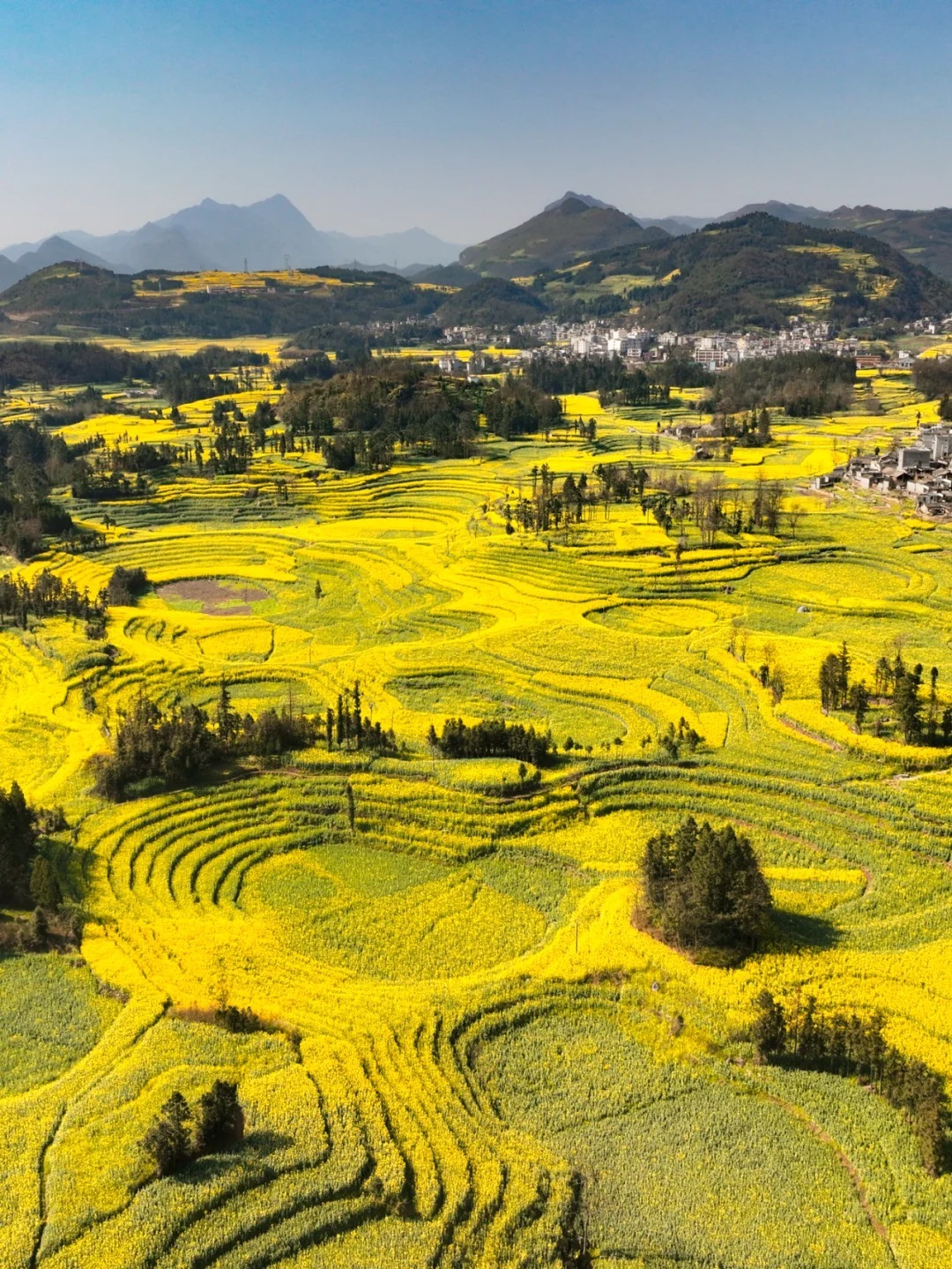 【罗平油菜花】中国最早绽放的金色春天,位于云南省曲靖市罗平县,是中国最大的油菜花观赏地之一,被誉为 "世界最大自然天成花园"(2002 年获吉尼斯世界纪录认证) 和"地球上春天最美丽的地方"(《环球人文地理》《中国国家地理》)。