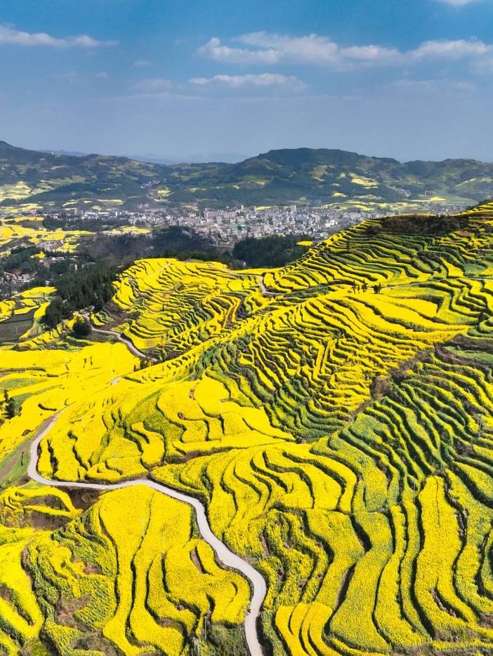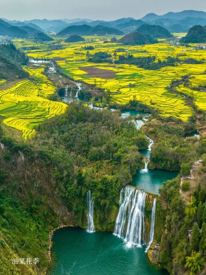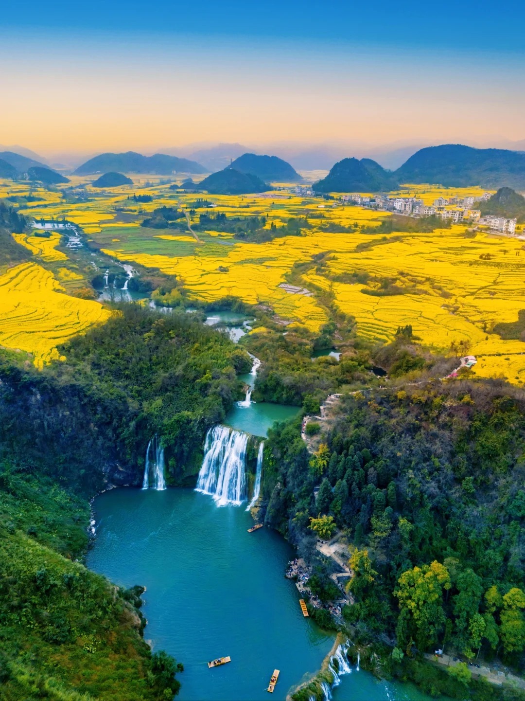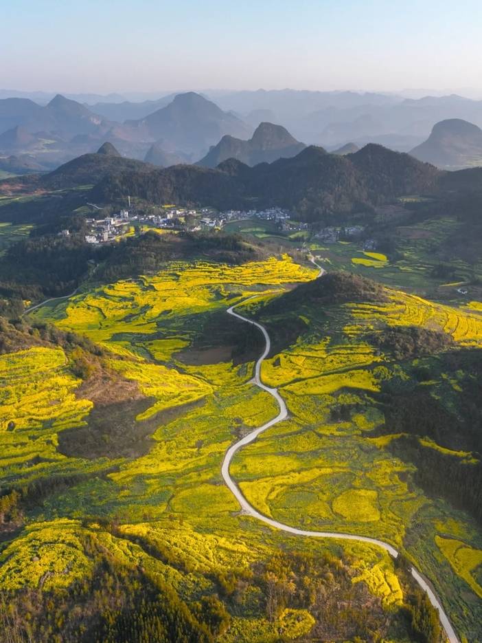 油菜花与喀斯特峰林完美融合,锥状山峰如绿色岛屿点缀金色花海,形成 "抬头是山,低头是花" 的独特景观,被称为 "花上桂林;