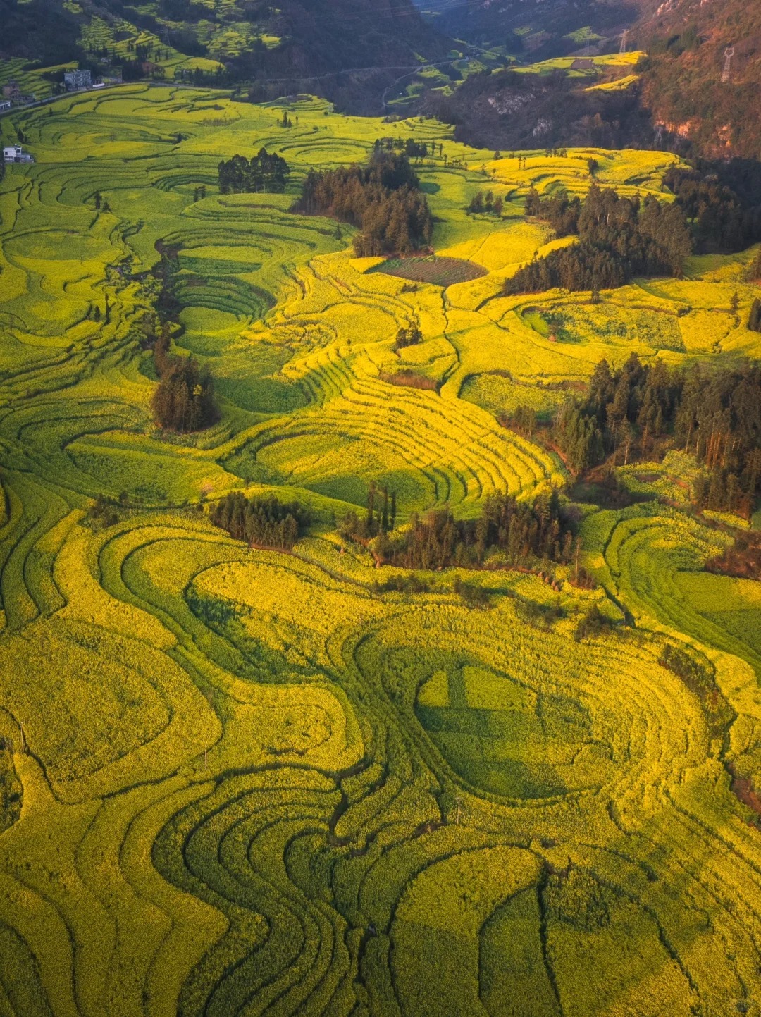 罗平牛街螺丝田:这种独特的梯田是圈状的,远远看去像是螺丝上的旋纹,油菜花与梯田的奇妙组合,形态奇特,线条优美,另具一格,日落十分景色更加魅力。