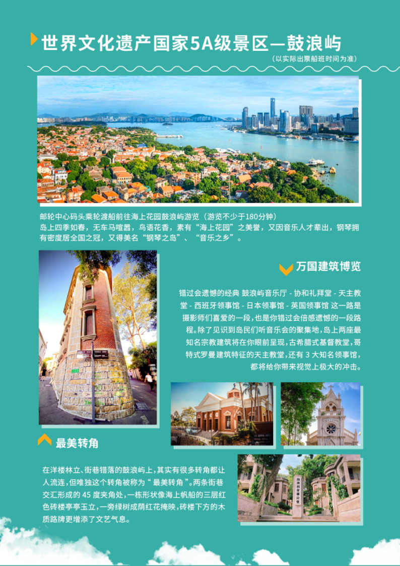 早上厦门市区酒店包接送(接送仅限岛内范围,思明区,湖里区),前往邮轮中心码头乘轮渡船前往海上花园鼓浪屿游览。具体请以导游通知为准,如所入住酒店无法接送,请按照导游通知集合地点时间集合;本行程导游会出游前一天19:00-21:30左右联系您,请注意查收短信或接听导游电话;请保持手机畅通。