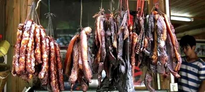 农家烟熏腊肉是通过腌制、晾晒、烟熏的方法制作的腊肉,常年挂在灶头上,可以长期保存。割下一块腊肉饭到饭锅里蒸熟后,切成片摆碟上桌,那扑鼻而来的喷香会让您回味无穷。肉微咸,和大葱一块儿炒,特别香,开胃下饭。