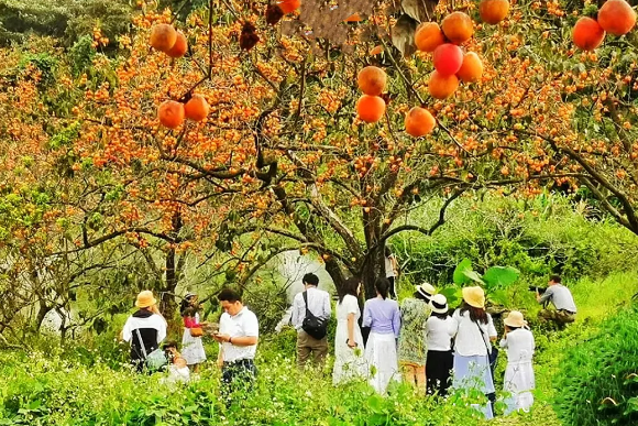 注:不想爬山的可以在果园自由拍照,300亩柿子里任由你拍摄,