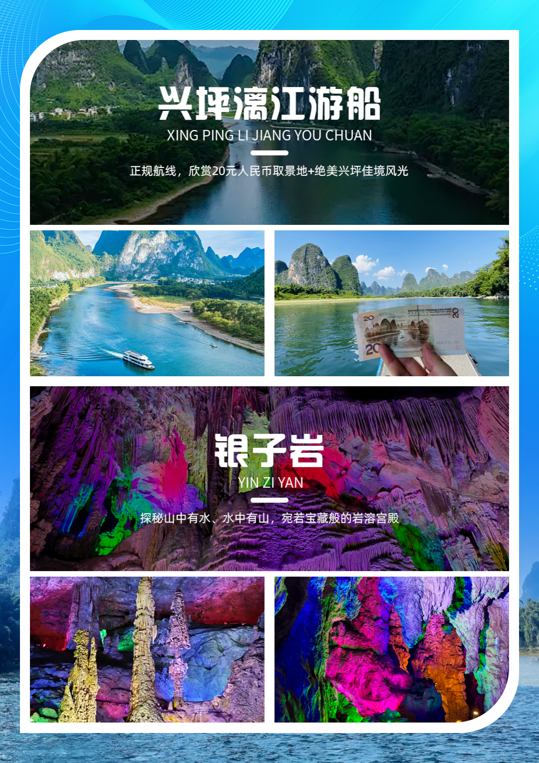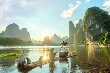 乘船游览二十元人民币取景地——【5A兴坪漓江】(AAAAA景区,游览时间约70分钟)。兴坪,桂林山水之精华,早有“阳朔山水甲桂林,阳朔最美在兴坪”的说法。这里有著名的二十元人民币背景图等精华景点。古往今来,兴坪秀丽的山山水水,引得无数文人墨客为之陶醉。船行江中,宛如迎面打开一幅幅奇妙山水画卷,可观奇峰倒影、渔翁闲钓,真正体会到“船在江中走,人在画中游”的绝美漓江仙境。(温馨提示:如遇【兴坪漓江景区】接待量超负荷、涨水、天气、交通堵塞等特殊情况导致无法游览,则调整为远观【20元人民币背景】及【唐人街竹筏游览】,敬请知悉。备注:【唐人街竹筏游览】,东起阳朔县城,以旖旎的自然风光著称。筏行江中,宛如迎面打开一幅幅奇妙山水画卷,沿途有书童苦读、秀才看榜、雪狮双岭、仙人坐车、美女梳妆、管家古榕树、八仙过海自然或人文景观。两岸的奇峰倒影、碧水青山,真正体会到“人在画中游”的绝美漓江仙境。)
