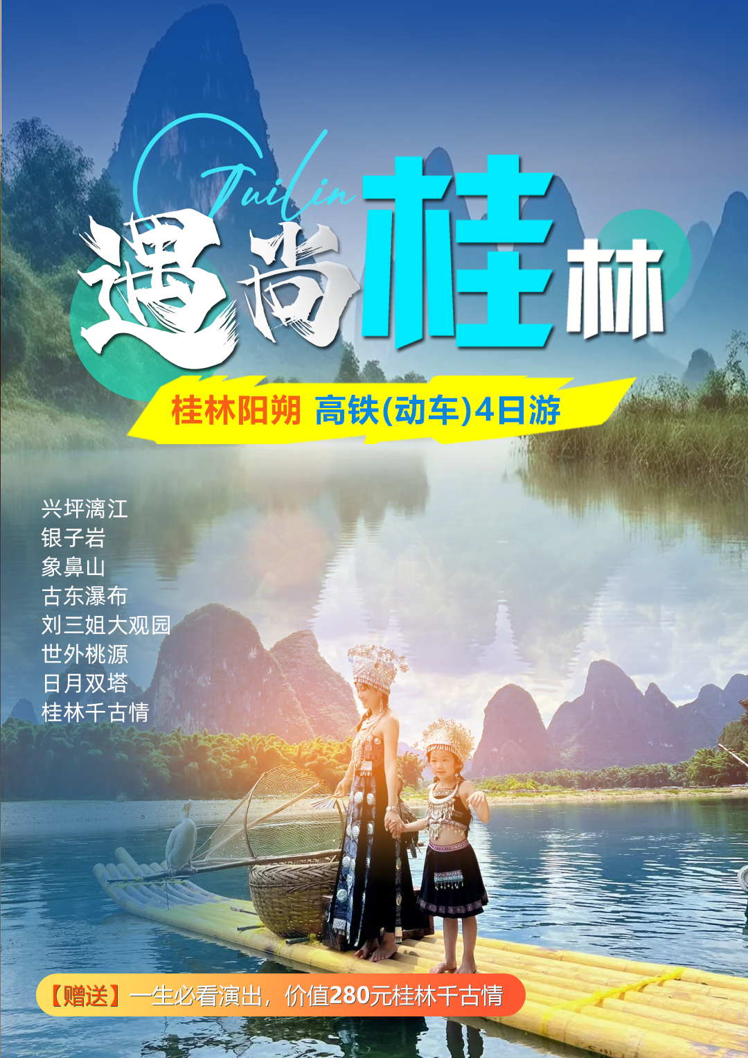(出发时间根据演出实际情况而定,演出时间随机安排 )赠送观看【桂林千古情】(游览时间约60分钟,赠送项目,不游不退)它浓缩了桂林万年的历史与民俗,是桂林文化的灵魂。演出涵盖了《千古灵渠》、《漓江恋歌》、《寻找刘三姐》等极具地方特色的节目,运用先进的声、光、电、全息等高科技手段和舞台机械,在水陆空三维立体空间,唱响了一曲感天动地的桂林千古传奇。给我一天,还你千年!除此之外,我们还能在景区内看到不同的民族风情,感受不同的少数民族文化。这里有热情的广场舞表演,执勤的帅气小哥哥和穿着民族服装的阿妹与阿哥更是让舞蹈好看又有趣,是景区网红抖音打卡点之一哦。景区内的阳朔古村营造了独特的农耕市井生活风貌,街边还有各种杂耍表演,让人感觉十分的逗趣和新颖。夜幕降临,华灯初上,朦胧夜色下的千古情景区更是浪漫迷人。一盏盏点燃起来的灯,包裹着景区的一草一木,沿着沙滩一圈的情人港区域,是“一山一世”时空隧道,这里有一间一间的茅草小屋,每一间都是和孩子拍照的好去处。