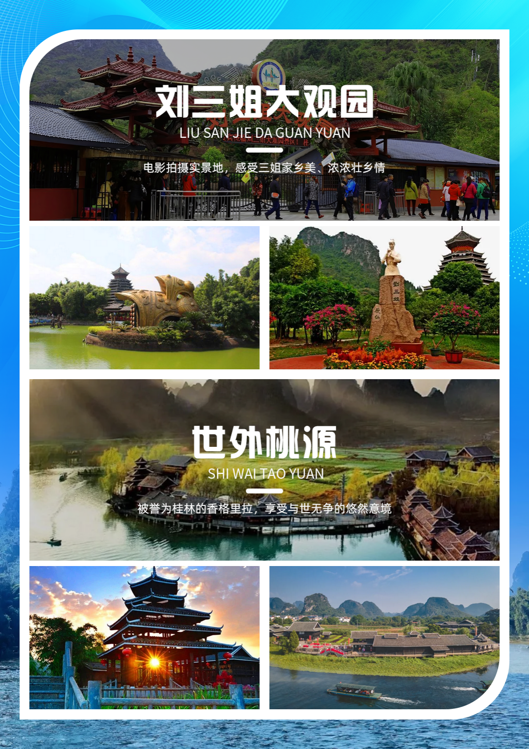 游览原汁原味、原生态、具有浓郁广西少数民族风情的《刘三姐》电影拍摄实景地—【经典刘三姐大观园】(AAAA级景区,游览时间约120分钟),景区内具有壮族特色的金蟾对歌台,造型奇特,令人大开眼界。高六米的大型汉白玉刘三姐塑像、硕大的多种石雕绣球、还原当年刘三姐与阿牛哥定情誓约的百年古榕、以及风雨长廊、壮寨干栏、瑶寨木楼、侗族鼓楼等均全国少见。再现电影《刘三姐》中莫府、阿牛家等场景,经典剧场中的“民族歌舞秀”让您亲身领略少数民族的独特风情。