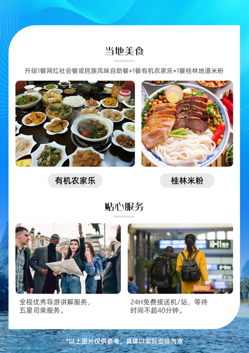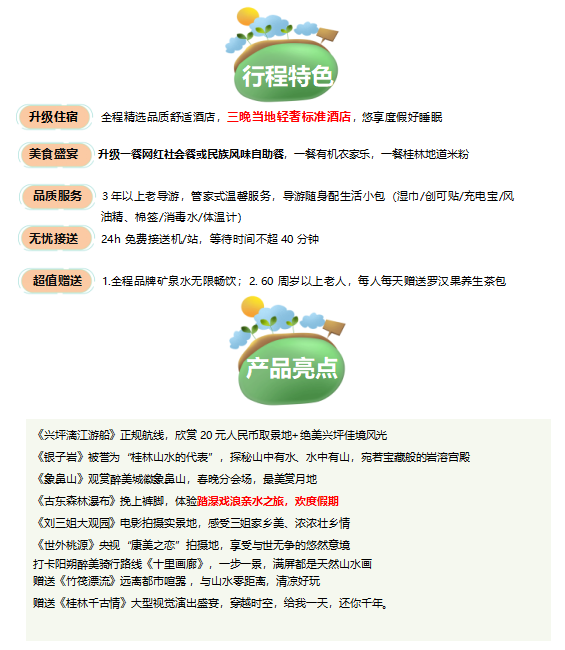 用餐标准: 全程3早2正+1米粉(正餐30元/人/正,一餐桂林地道米粉、一餐有机无公害农家乐,升级一餐网红社会餐《小南国》或《金龙寨》或《谢三姐啤酒鱼》或《风味自助餐》)10人一桌8菜1汤,如人数不足将酌情减少菜量,若用餐人数不足8人,导游现退餐费;早餐在酒店为赠送,不占床无早餐)。若自愿放弃用餐,不退费用;若特色餐开餐人数不足则安排同等价值的退餐。