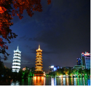 远观【日月双塔】地处桂林市中心区,坐落在桂林城的中轴线上是新桂林的标识。日塔、月塔与象山上的普贤塔、塔山上的寿佛塔,相互呼应,相互映衬,有“四塔同美”之说。桂林日月双塔号称世界第一铜塔,是桂林旅游的一个绝美夜景观赏地。