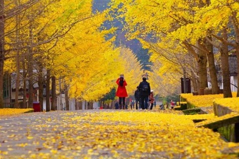 黄金大道,街道边种了两排银杏树,和白色的路灯相配,宛若欧洲小镇,风情万种,金秋的帽子峰,呈现给游客一个五彩斑斓的世界。