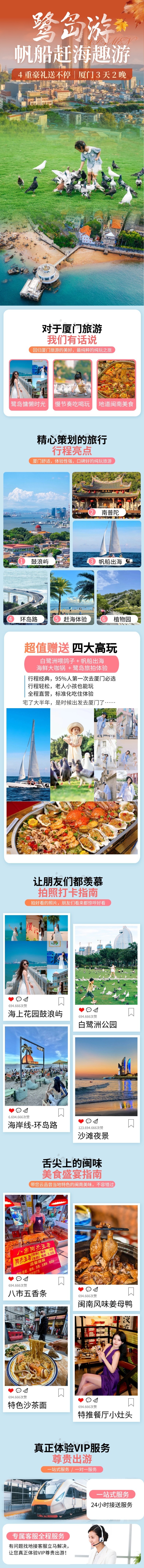 帆船出海、白鹭洲、鼓浪屿、网红打卡琴岛旅拍/市区航拍、环岛路、赶海体验、植物园、白鹭洲喂鸽子。