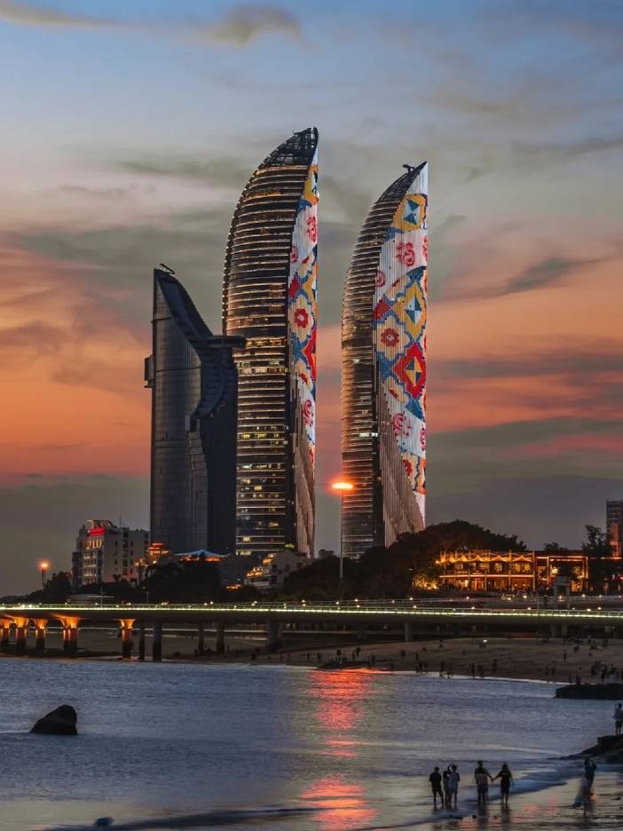 紧接着乘车前往 【厦门金砖五国首脑会址(外观)】厦门金砖会址是2017年金砖国家领导人第九次会晤的举办地点——厦门国际会议中心,会标的主图案既是鼓满的风帆,也是旋转的地球,五种颜色代表着金砖五国。既象征五国团结合作,同舟共济,乘风破浪,驶向更加美好未来,也有着金砖国家在世界政治经济事务中发挥着重要作用的深刻寓意。图案下方嵌入金砖国家英文名称“BRICS”、年份“2017”、中国英文名称“CHINA”和红色中国印。印章用中文点明了中国为2017年金砖国家主席国,与英文“CHINA”相辅相成,且采用古字体大篆,有着浓厚的中华传统文化韵味。(车游外观不能停靠)